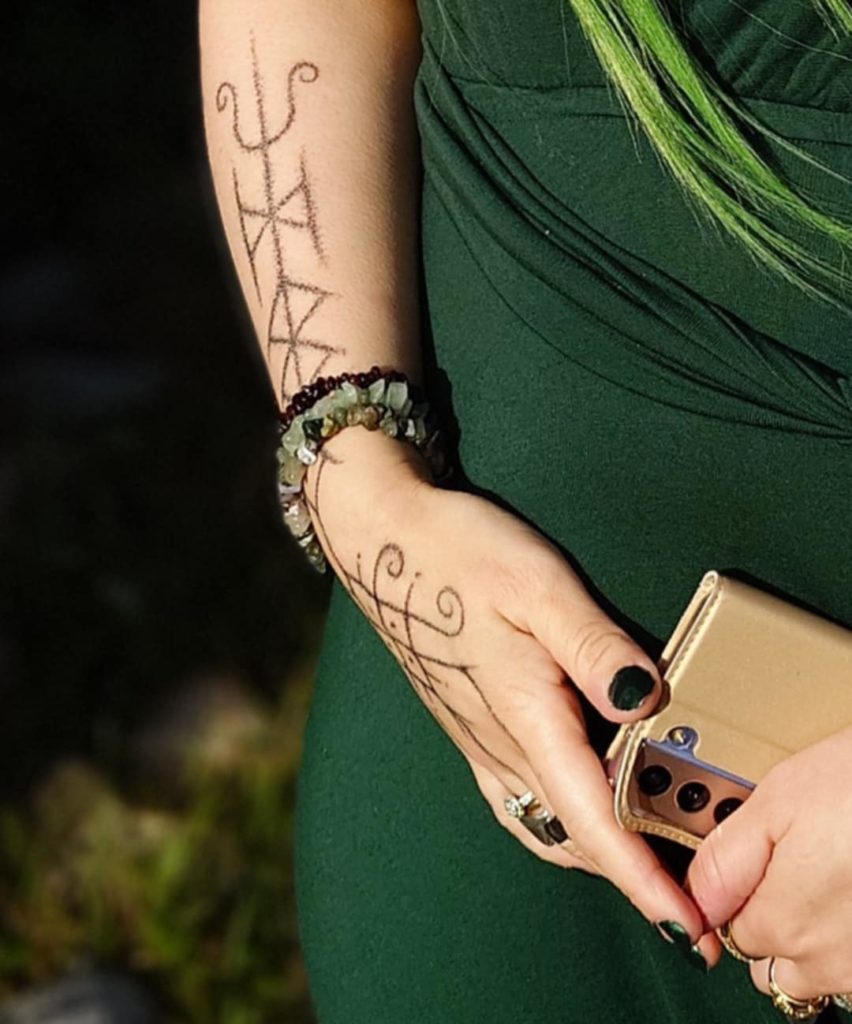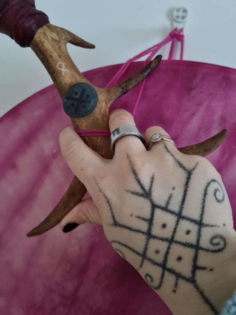 Syksyllä toteutin myös pitkään hautoneen visioni perinnetatuoinnista käteen. Se on Kirsti Runavikin tekemä, ja se yhdistelee riimuja ja lappilaisia perinnesymboleita muodostaen vahvan loitsun joka auttaa ja kuvastaa työtäni kätilönä.