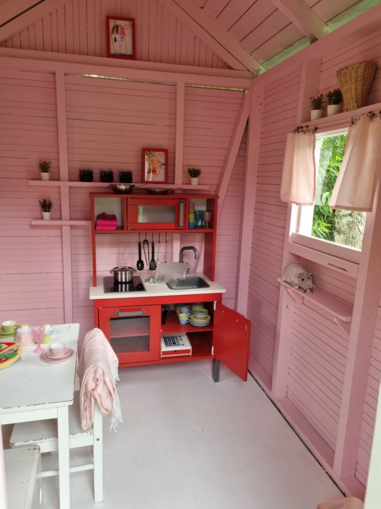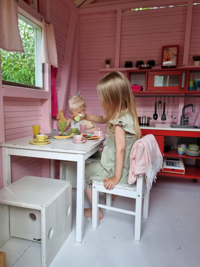 Kesällä uudistin myös lasten leikkimökin. Maalasin sisustan kokonaan uusiksi, ja kalustin ja sisustin sen pikkuneideille sopivaksi. Se oli ihana projekti!